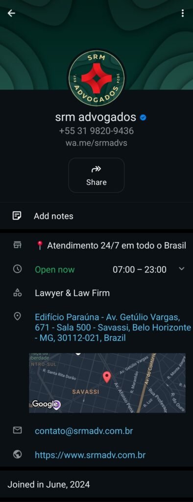 Para reforçar a segurança de nossos clientes, disponibilizamos abaixo um print do nosso contato oficial. Repare que o número possui o selo de verificação da Meta, confirmando que este é o único canal de contato do escritório. Não utilizamos nenhum outro telefone ou WhatsApp para tratar de assuntos jurídicos. Caso receba mensagens de números diferentes, desconsidere, bloqueie e nos encaminhe a captura de tela para que possamos adotar as medidas cabíveis junto às autoridades.